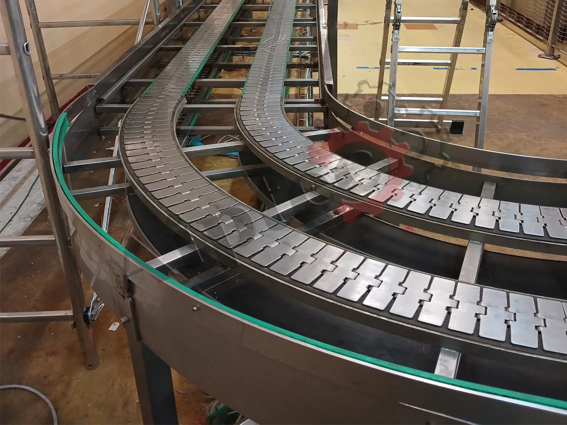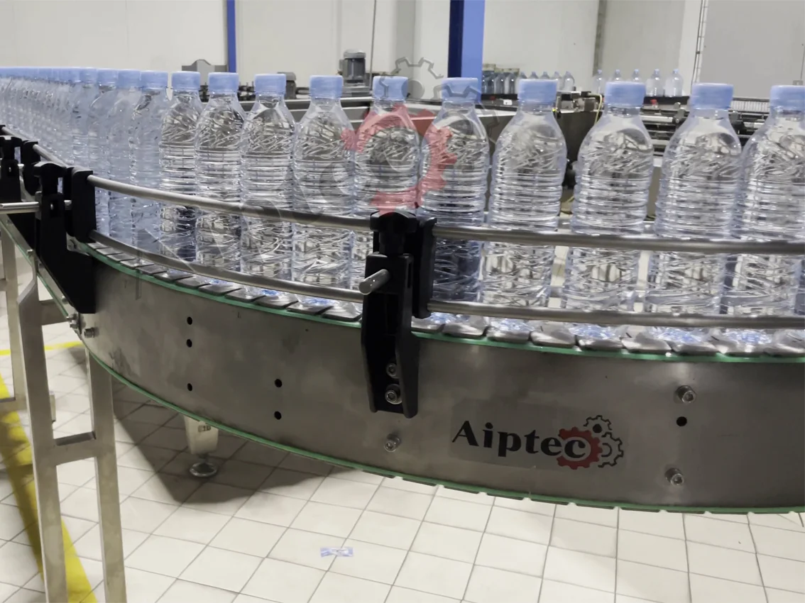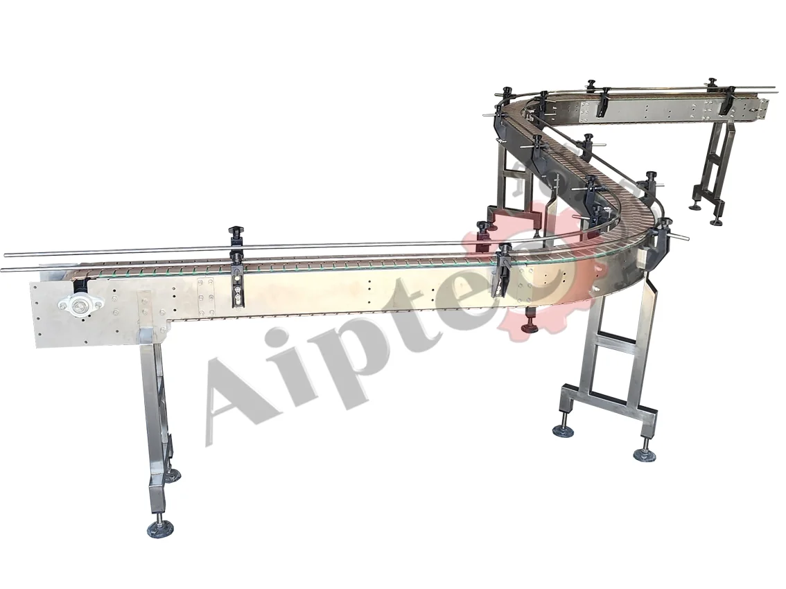 Le convoyeur à chaîne à palettes en configuration courbe est une solution technique incontournable signée AIPTEC, fabricant marocain leader du convoyage industriel. Parfaitement adapté aux bouteilles, bidons, boîtes métalliques, emballages carton ou packs divers, il permet de changer la direction de votre ligne de production (45°, 90°, 180°) tout en maintenant une stabilité parfaite des produits, même pleins ou sans emballage. Sa conception à palettes articulées épouse la courbe sans à-coups, éliminant les risques de coincement, de basculement ou de collision entre unités. Idéal pour optimiser l’encombrement au sol dans les environnements industriels contraints (agroalimentaire, pharmaceutique, cosmétique, chimique ou pétrolier), il supprime les systèmes de virage par pousseurs ou par tables tournantes, sources de ralentissements. En assurant une continuité parfaite du convoyage entre deux droites, il réduit les zones de manutention intermédiaire et préserve l’intégrité des produits. Robuste, silencieux, facile d’entretien et compatible avec les nettoyages fréquents, entièrement fabriqué au Maroc, il représente la solution idéale pour fluidifier vos lignes de production en courbe.